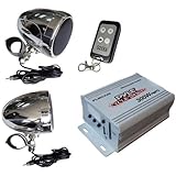 300W MOTORCYCLE/ATV/SNOWMOBILEDUAL HANDLE-BAR WEAT,, FM radio/auxiliary modes, Built-in FM radio electric auto-scan tuning, FM coverage: 87.5?108.0MHZ, Up/down auto-scan tuning system, 3.5mm stereo input jack, Mini amplifier suitable for 12 volts motorcycles/scooters/boats/snowmobiles/ATV/waverunners, 50 watts ? 2 @ 2ohm 10%THD, Frequency response 20Hz?20KHz, Signal/noise ratio: >50dB, Features 3" dual weatherproof speakers, USB port supports USB flash memory, Includes remote control, mounting brackets and accessories